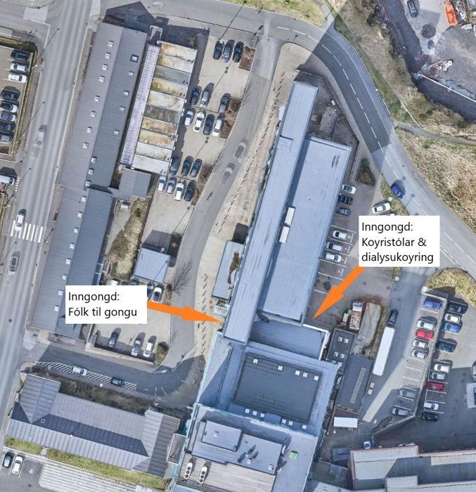 Um jarðarferð er, verða koyristólar og dialysukoyring beind gjøgnum Bráðmóttøkuna til vinstru fyri høvuðsinngongdina.