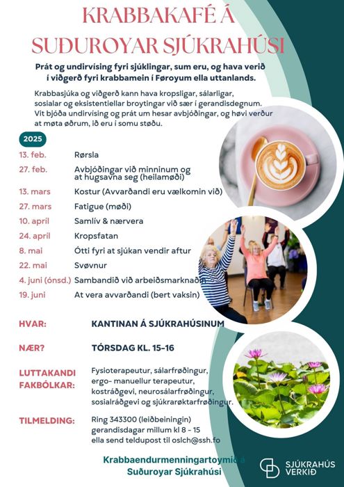 Skipað verður fyri krabbakafé í kantinuni á Suðuroyar Sjúkrahúsi annan hvønn tórsdag kl. 15-16.